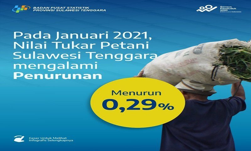 DINAMIKASULTRA.COM,KENDARI-Badan Pusat Stattistik (BPS) Sulawesi Tenggara mengumumkan nilai tukar petani (NTP) Sultra pada Januari 2021 tercatat 97,00 atau mengalami penurunan sebesar 0,29 persen dibanding bulan sebelumnya yang tercatat sebesar 97,28.