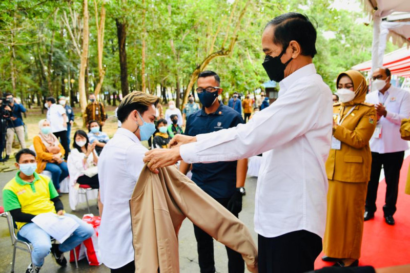 DINAMIKASULTRA.COM,KENDARI-Presiden RI Joko Widodo menghadiahkan jaket pribadi yang dikenakan kepada Steven Stenly saat meninjau pelaksanaan vaksinasi COVID-19 di pelataran praja Kantor Gubernur Sulawesi Tenggara, Rabu..