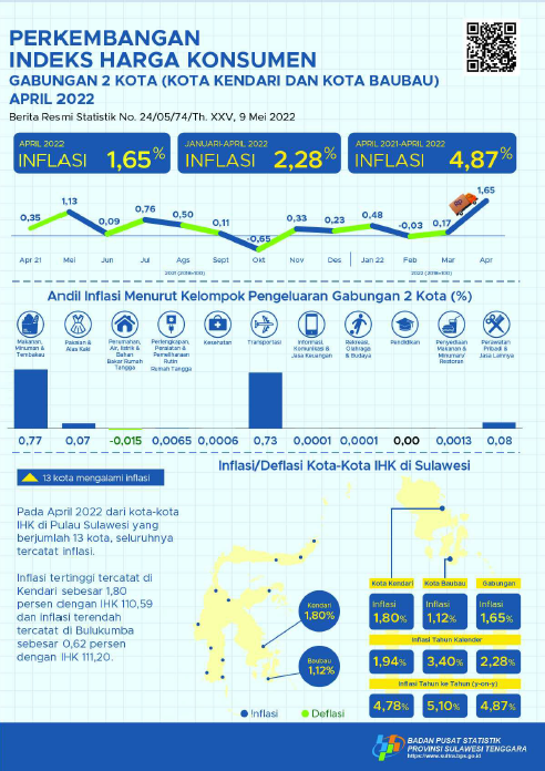 DINAMIKASULTRA.COM, KENDARI – Badan Pusat Statistik (BPS) Sulawesi Tenggara menyebutkan pada April 2022 terjadi Inflasi gabungan dua kota di Sultra sebesar 1,65 persen dengan Indeks Harga Konsumen (IHK) sebesar 110,33.
