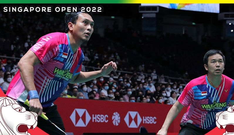 Ganda putra Indonesia Hendra Setiawan/Mohammad Ahsan lolos dari tekanan setelah melalui laga sulit menghadapi pasangan asal India M.R. Arjun/Dhruv Kapila sebelum akhirnya maju ke semifinal Singapore Open 2022 di Singapura, Jumat (16/7/2022,3:20 PM). (ds/ANTARA/Twitter/@INABadminton/pri.)