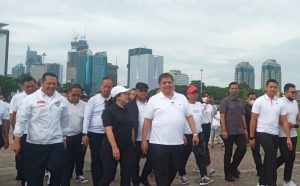 Berdasarkan pantauan ANTARA, Airlangga tiba lebih dulu di Monas dengan setelan kaos berwarna putih serta celana hitam sekitar pukul 07.36 WIB, dan disambut oleh sejumlah elite Partai Golkar, di antaranya Sekretaris Jenderal (Sekjen) Lodewijk F Paulus, Wakil Ketua Umum (Waketum) Bambang Soesatyo, Waketum Koordinator Bidang Pemenangan Pemilu Ahmad Doli Kurnia, dan Waketum Koordinator Bidang Komunikasi dan Informasi Nurul Arifin.