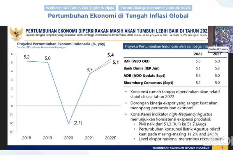 “Ketahanan ekonomi Indonesia ini saya rasa masih sangat kuat. Kuartal II-2022 kemarin kita tumbuh dengan 5,4 persen dan tahun 2022 ini kami yakin di atas 5 persen mungkin sekitar 5,2 persen,” katanya dalam Webinar 100 Tahun Eka Tjipta Widjaja di Jakarta, Senin.