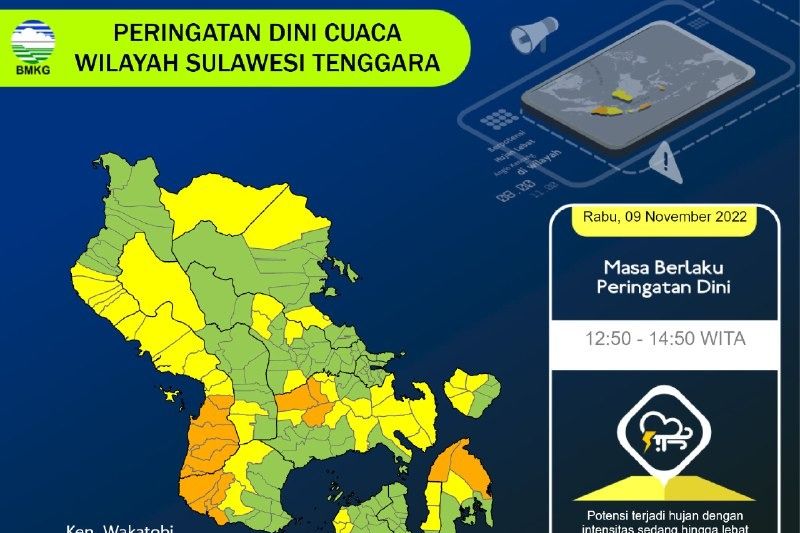 Di Kabupaten Kolaka diperkirakan hujan pada wilayah kecamatan Wundulako, Pomalaa dan Baula, Kabupaten Konawe Selatan di kecamatanTinanggea, Andoolo, Palangga, Palangga Selatan, Laeya, Baito, dan sekitarnya.