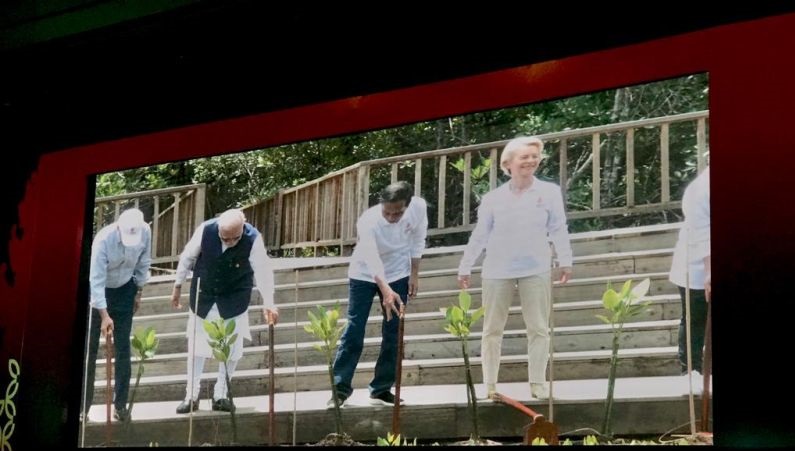 Presiden Republik Indonesia Joko Widodo memimpin kegiatan penanaman bakau di Taman Hutan Raya (Tahura) Ngurah Rai. Ia berdiri diapit oleh Perdana Menteri India Narendra Modi di sisi kanan, dan Presiden Komisi Eropa Ursula Gertrud von der Leyen di sebelah kiri. Sementara itu, Presiden Amerika Serikat Joe Biden berdiri tepat di sisi kanan PM Modi.