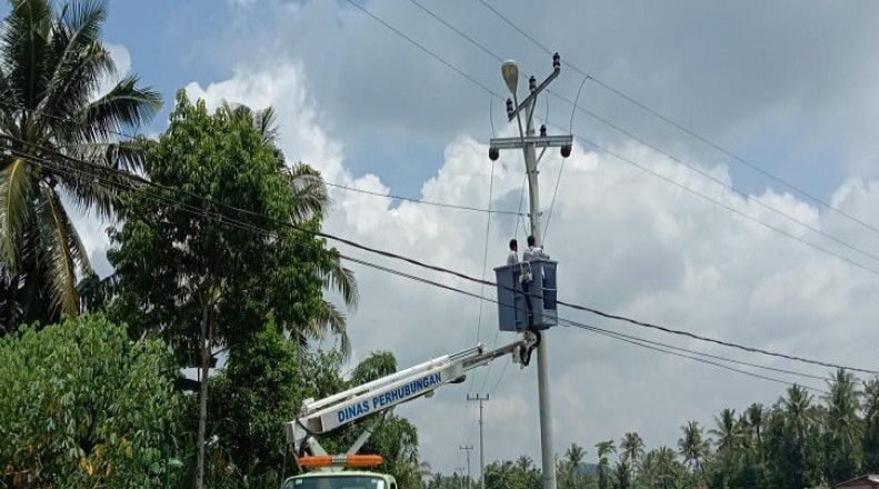 Ilustrasi – Petugas dari Dinas Perhubungan saat melakukan pemasangan lampu jalan.(Istimewa)