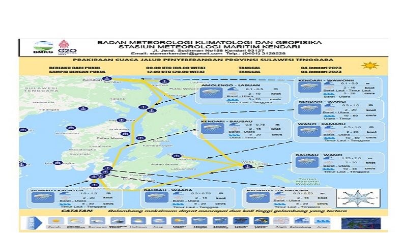 “Gelombang yang mencapai empat meter itu terjadi di perairan Selatan Wakatobi bagian barat dan Perairan Selatan Wakatobi bagian timur,” kata Koordinator Observasi dan Informasi Stasiun Meteorologi Maritim Kendari, Faizal Habibie yang diterima di Kendari, Rabu (4/1/2023).