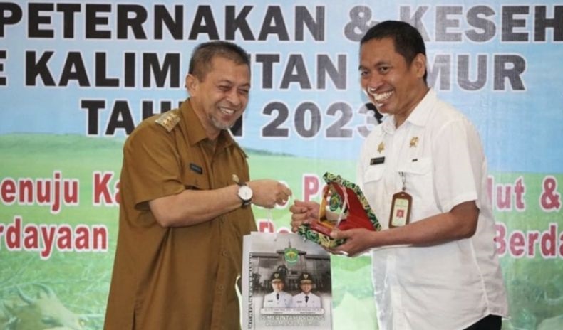 Penghargaan diserahkan oleh Wakil Gubernur Kaltim Hadi Mulyadi pada Rapat Konsultasi dan Koordinasi Teknis Daerah (Rakontekda) dan Forum Perangkat Daerah (FPD) Pembangunan Peternakan dan Kesehatan Hewan Tahun 2023 se-Kaltim, di Balikpapan, Selasa (14/2).