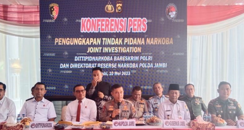 DINAMIKA SULTRA.COM, JAMBI – Kepolisian Daerah Jambi bersama dengan Ditipidnarkoba Bareskrim Polri dan Polda Banten menggagalkan penyelundupan narkotika jenis sabu cair seberat 264,7 kilogram dari seorang tersangka warga negara asing.