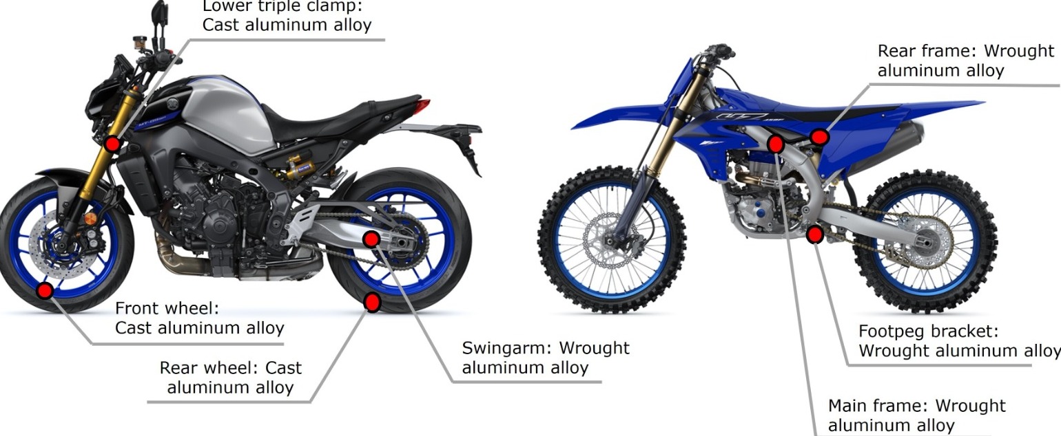 Aluminium adalah salah satu bahan baku terpenting dalam pembuatan sepeda motor dan suku cadangnya, dan menyumbang sekitar 12% hingga 31% dari total berat kendaraan (berdasarkan riset internal Yamaha Motor pada tahun 2022), proporsi ini jauh lebih tinggi daripada kendaraan lainnya.