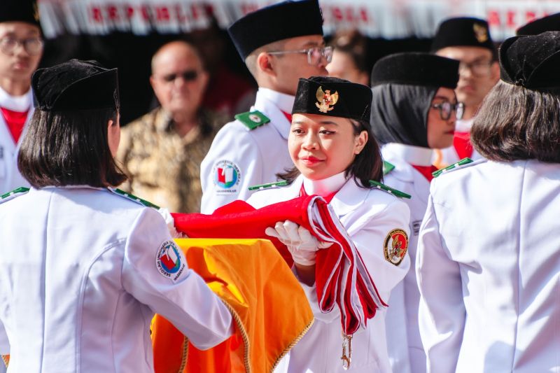 Para peserta upacara mengenakan pakaian adat dan batik aneka rupa dan warna yang menunjukkan kekayaan budaya Nusantara.