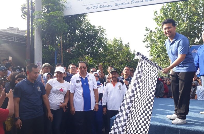 SBY ikut serta jalan sehat bersama masyarakat serta kader partai menyusuri sejumlah jalan di Kelurahan Tamanan, Kota Kediri tersebut.