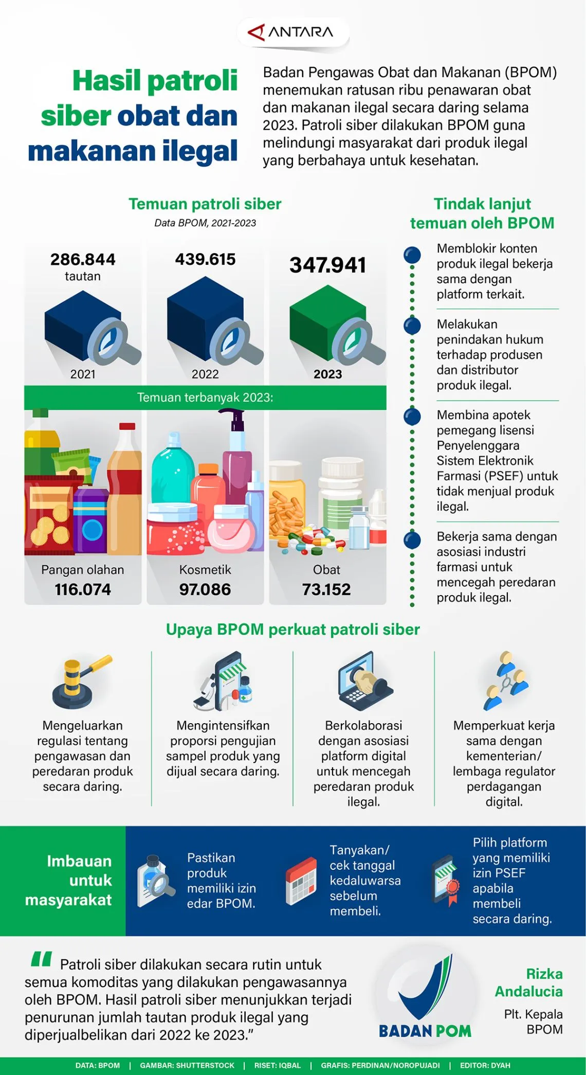 Badan Pengawas Obat dan Makanan (BPOM) menemukan ratusan ribu penawaran obat dan makanan ilegal secara daring selama 2023. Patroli siber dilakukan BPOM guna melindungi masyarakat dari produk ilegal yang berbahaya untuk kesehatan.