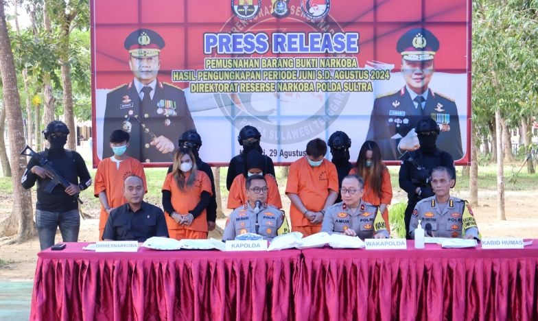 DINAMIKA SULTRA.COM, KENDARI – Polda Sulawesi Tenggara (Sultra) mengungkapkan hasil operasi pemberantasan tindak pidana narkotika yang dilakukan selama periode Juni hingga Agustus 2024 dengan menangkap lima tersangka kasus narkotika lintas provinsi dan internasional.