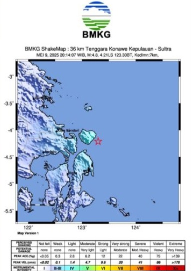 Kepala Stasiun Geofisika BMKD Kendari Rudin saat dihubungi di Kendari, Jumat malam, mengatakan bahwa gempa bumi itu terjadi sekitar pukul 21.14 Wita, mengguncang wilayah Tenggara Wawonii Tenggara, Kabupaten Konawe Kepulauan.