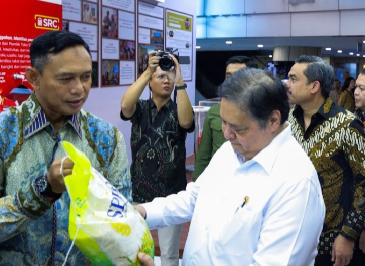 Direktur Utama Perum Bulog Ahmad Rizal Ramdhani (kiri) menunjukkan beras program SPHP kepada Menteri Koordinator Bidang Perekonomian Airlangga Hartarto (kanan) dalam Pesta Rakyat untuk Indonesia 2025 di Smesco Indonesia, Jakarta, pada 22–23 Agustus 2025, Jakarta, Jumat (22/8/2025). (ds/ANTARA/HO-Humas Bulog)
