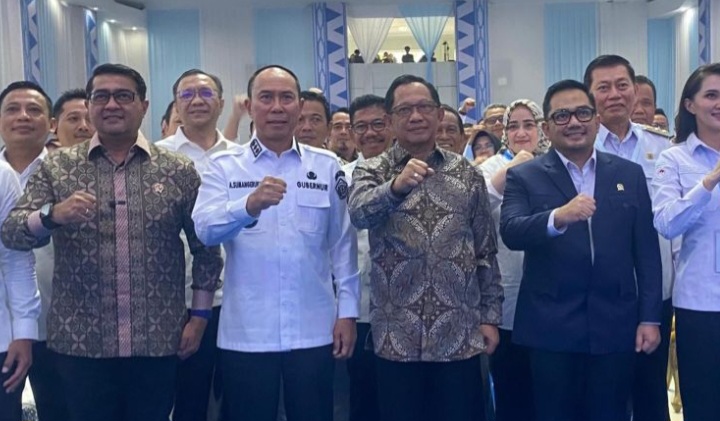 Gubernur Sultra Andi Sumangerukka (kedua kiri) saat foto bersama dengan Mendagri RI Tito Karnavian (ketiga kiri) di kegiatan Rakornas PHD 2025. (Ist)