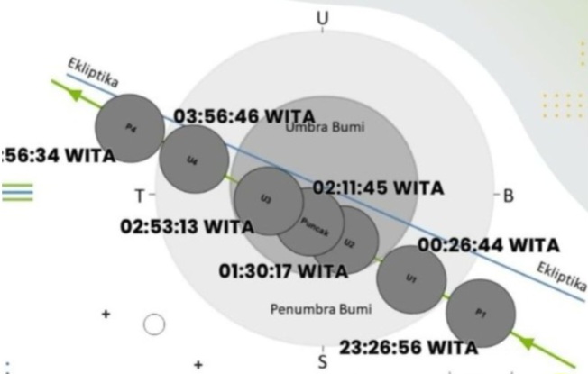 Adapun waktu fase gerhana bulan total tersebut, yakni dimulai pukul 23.56 Wita fase gerhana penumbra, kemudian pukul 00.26 Wita fase gerhana sebagian mulai, 01.30 Wita gerhana total mulai, 02.11 Wita puncak gerhana, 02.53 Wita gerhana total berakhir, 03.56 Wita gerhana sebagian berakhir, dan pukul 04.56 Wita gerhana penumbra berakhir.(ds/ono)