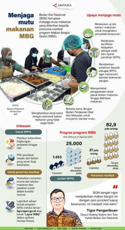 Menjaga Mutu Makanan MBG By Sugiono On Jumat, 17 Oktober 2025 | 07:10 2,001 Listen to this article Badan Gizi Nasional (BGN) berupaya menjaga mutu makanan yang diberikan kepada penerima manfaat program Makan Bergizi Gratis (MBG) guna mencegah kasus keracunan. MBG 2,001 Share FacebookTwitterGoogle+ReddItWhatsAppPintereste-mail