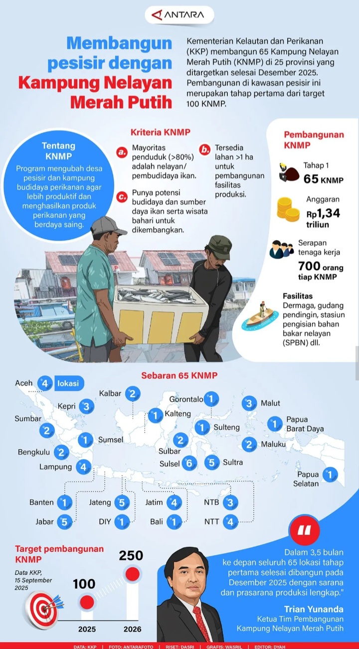 Kementerian Kelautan dan Perikanan (KKP) membangun 65 Kampung Nelayan Merah Putih (KNMP) di 25 provinsi yang ditargetkan selesai Desember 2025. Pembangunan di kawasan pesisir ini merupakan tahap pertama dari target 100 KNMP.