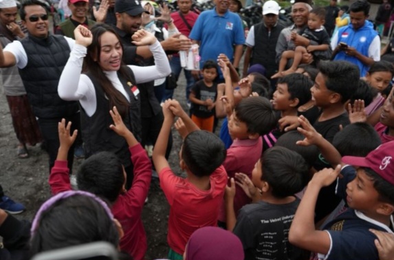Utusan Khusus Presiden bidang Pariwisata Zita Anjani berdialog dengan anak2x yang terdampak erupsi Gunung Semeru di Kecamatan Pronojiwo, Kabupaten Lumajang, Sabtu (22/11/2025). (ds/ANTARA/HO-UKP Pariwisata.)