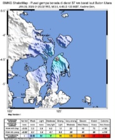“Atau tepatnya berlokasi di darat pada jarak 37 kilometer Barat Laut Buton Utara, pada kedalaman 5 kilometer,” ujarnya.