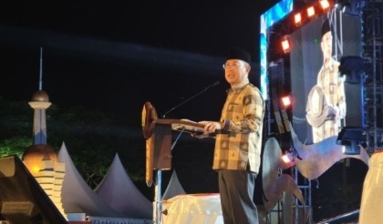 Gubernur Sultra Andi Sumangerukka membawakan sambutan pembukan Harmoni Sultra, Jumat (24/4/2026) malam. (Ist)