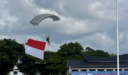 Penerjun TNI AU yang membawa Bendera Merah Putih saat mendarat di Kawasan Eks MTQ Kendari, Sulawesi Tenggara, Senin (27/4/2026). (Ist)