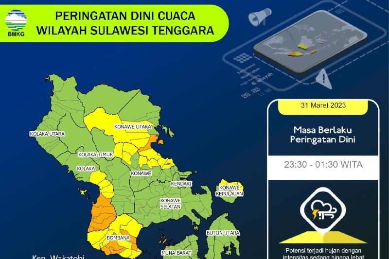 Pada malam hari juga berpotensi hujan ringan di wilayah Kabupaten Kolaka dan Kolaka Utara, sedangkan pada dini hari berpotensi hujan ringan di wilayah Kabupaten Kolaka dan sekitarnya.