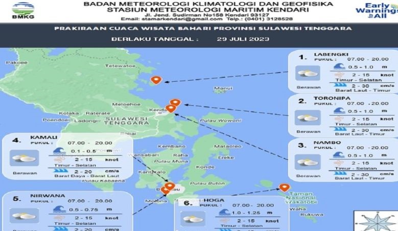 “Cuaca cerah berawan sejak pagi hingga siang hari, walaupun ada kabupaten di Sultra masih berpotensi hujan ringan,” kata Koordinator Bidang Observasi dan Informasi Stasiun Meteorologi Maritim BMKG Kendari Faizal Habibie. dalam keterangan resmi yang diterima di Kendari, Senin (10/7/2023).