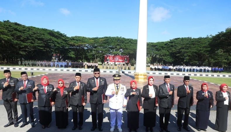 DINAMIKA SULTRA.COM, KENDARI – Penjabat Gubernur Sulawesi Tenggara Komjen Pol. (Purn) Andap Budhi Revianto atas nama Presiden RI Joko Widodo menyematkan penghargaan Satya Lencana Karya Satya bagi 12 aparatur sipil negara (ASN) di lingkup Pemprov setempat di Kendari, Sabtu.