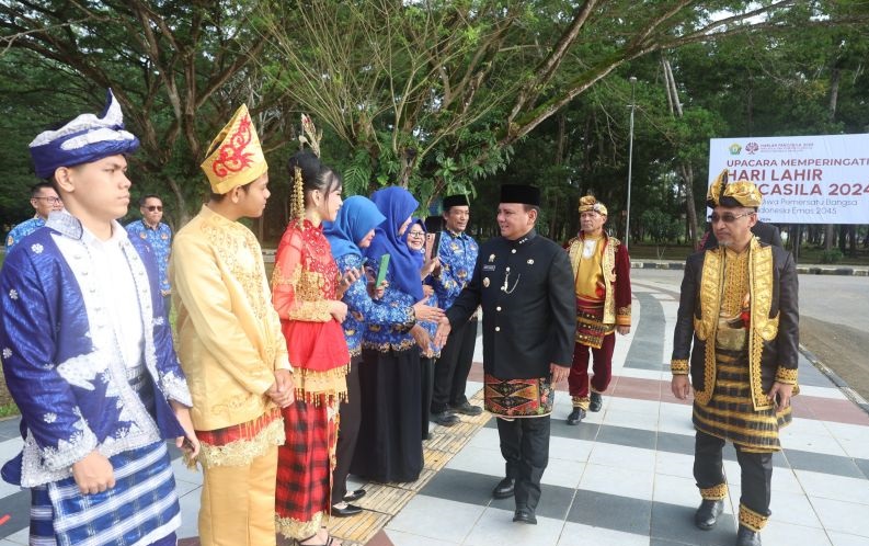 Pj. Gubernur selanjutnya membacakan amanat dari Kepala BPIP Prof Drs Yudian Wahyudi, M.A Ph.D dengan esensi bahwa hari ini merupakan momen bersejarah lahirnya Pancasila ketika Ir Soekarno dalam sidang Badan Penyelidik Usaha Persiapan Kemerdekaan (BPUPK) mengusulkan lima prinsip dasar yang disebut Pancasila, kemudian diterima secara luas sebagai fondasi ideologis negara Indonesia.