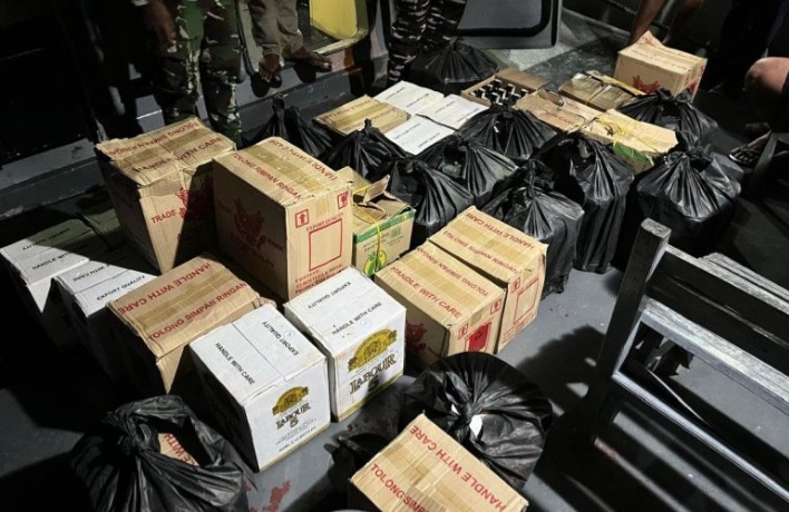 Setelah kapal itu diberhentikan, personel TNI AL langsung naik ke kapal untuk memeriksa muatan. Berdasarkan hasil pemeriksaan, personel TNI AL minuman keras non-cukai asal Malaysia.