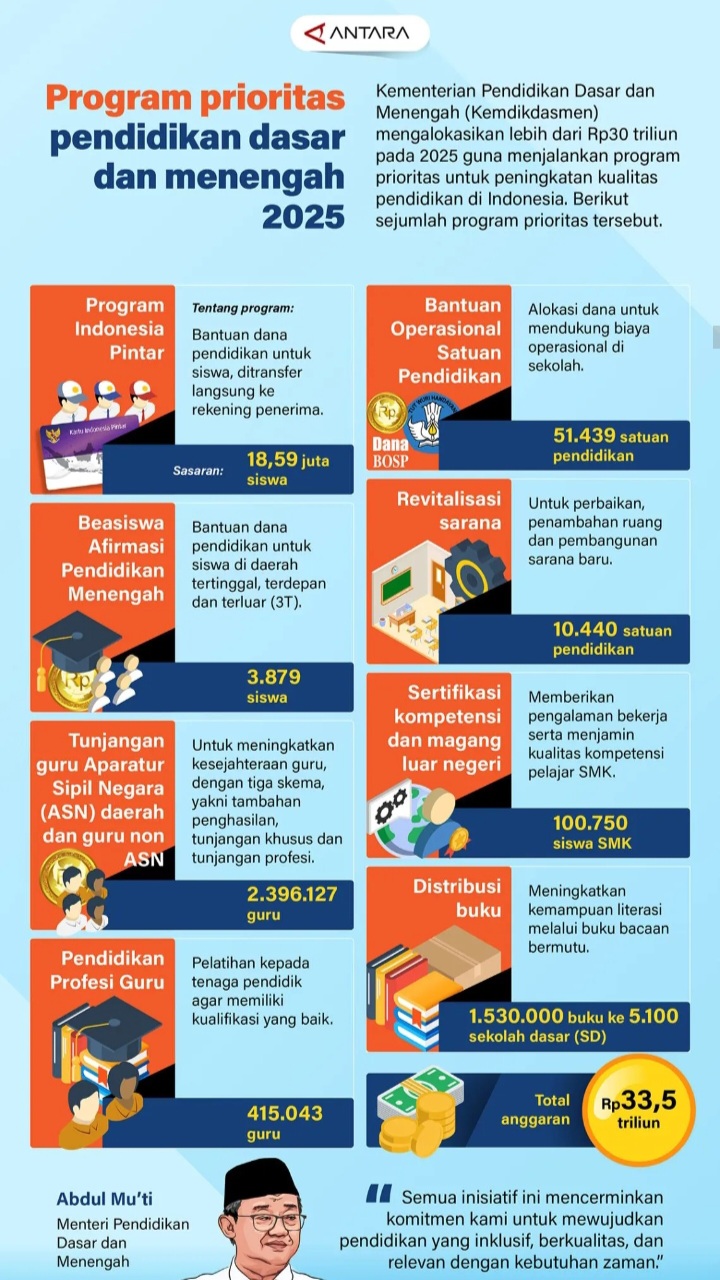 Kementerian Pendidikan Dasar dan Menengah (Kemdikdasmen) mengalokasikan lebih dari Rp30 triliun pada 2025 guna menjalankan program-program prioritas untuk peningkatan kualitas pendidikan di Indonesia. Berikut sejumlah program prioritas tersebut.