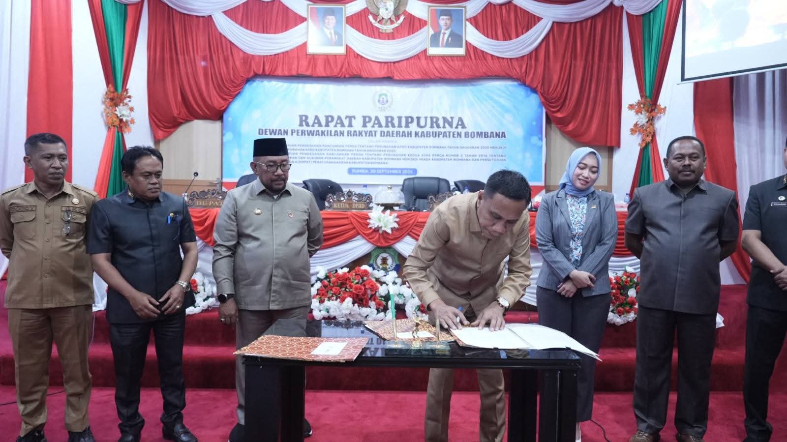 Pertama, pengesahan Raperda tentang Perubahan Anggaran Pendapatan dan Belanja Daerah (APBD) Kabupaten Bombana Tahun Anggaran 2025 menjadi Peraturan Daerah.
