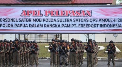 DINAMIKA SULTRA.COM, KENDARI – Kepolisian Daerah (Polda) Sulawesi Tenggara (Sultra) mengirim 100 personel Satuan Brigade Mobil (Sat Brimob) ke Papua untuk melakukan pengamanan objek vital nasional PT Freeport Indonesia.