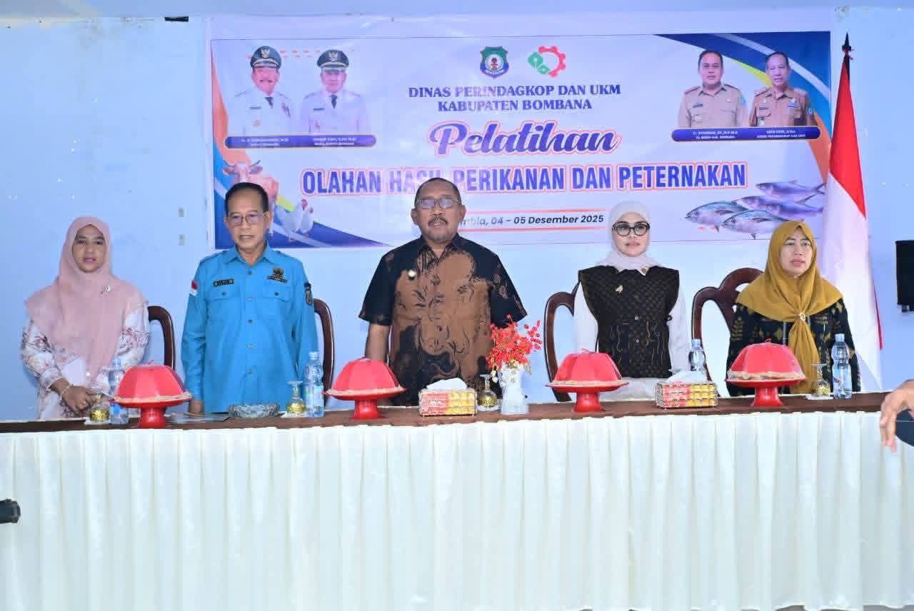 DINAMIKA SULTRA.COM, BOMBANA — Bupati Bombana Ir. H. Burhanuddin, M.Si., membuka secara resmi Pelatihan Olahan Hasil Perikanan dan Peternakan yang digelar Dinas Perindagkop dan UKM di Aula Hotel Grand Lampusui Rumbia, Kamis (4/12/2025), sebagai upaya memperkuat kapasitas pelaku UMKM agar produk lokal semakin kompetitif.