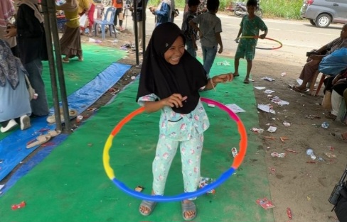 Untuk mendukung tujuan tersebut, berbagai sarana permainan dibawa dan disumbangkan langsung kepada anak-anak di pengungsian.