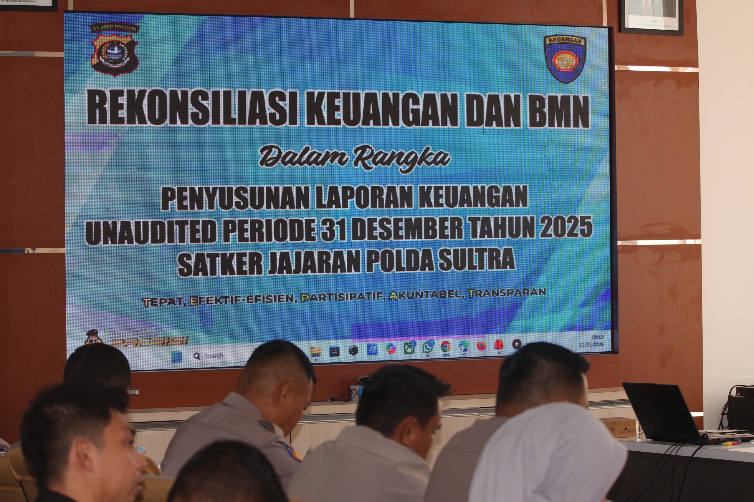 DINAMIKA SULTRA.COM, KENDARI – Kepolisian Daerah Sulawesi Tenggara (Polda Sultra) menggelar kegiatan Rekonsiliasi Keuangan dan Barang Milik Negara (BMN) dalam rangka Penyusunan Laporan Keuangan Unaudited Periode 31 Desember 2025 bagi satuan kerja (satker) jajaran Polda Sultra.
